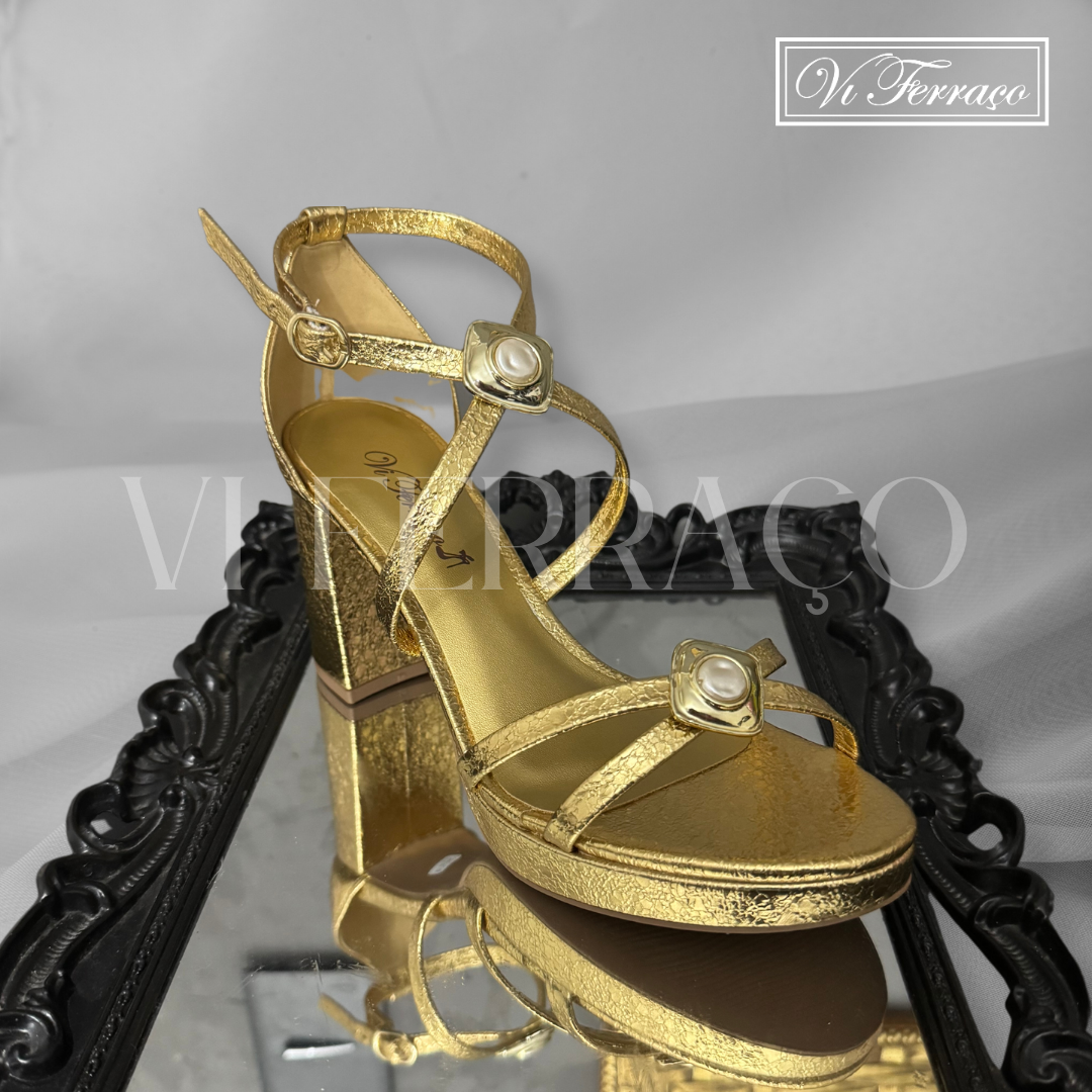 Material: New ouro Salto: Bloco 9cm Meia pata: 2cm Fivela ajustável Palmilha: Acolchoada